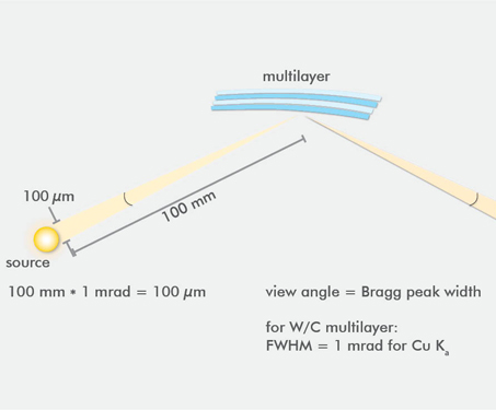 The graphic illustrates that the multilayer optics are an ideal combination for X-ray sources with a focal spot diameter well below 100 µm on the anode. With larger sources, the range of incident angles increases. Therefore, the multilayer optics can only reflect the incident beam partially as the other X-rays do not fulfil Bragg‘s law.