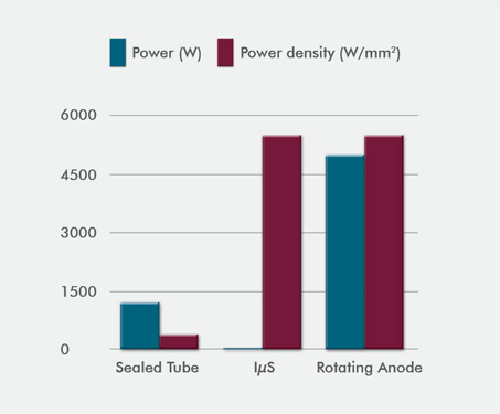 Due to the larger surface-to-volume ratio for the focal spot on the anode compared to the old 1-2 kW sealed tubes, the microfocus sealed tube benefits from an improved heat dissipation and, thus, allows significantly higher power densities. With values larger than 5 kW/mm2, the performance of the IµS is comparable to 5 kW-class rotating anodes (see graphic).