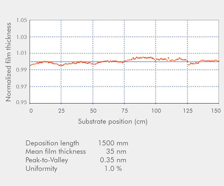 We can deposit stripes of single layer films up to a length of 150 cm, as well as laterally and depth graded multilayers over a length of up to 50 cm.