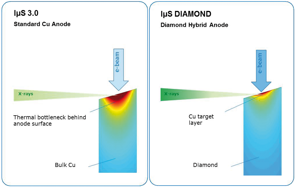 In the ixtube for the IµS DIAMOND II, the thin layer of the target material produces the X-rays while the underlying diamond substrate dissipates the heat load significantly more efficiently than a conventional bulk copper anode, as shown in the right figure comparing simulations of the heat dissipation. Consequently, the diamond hybrid anode can accept a higher power density in the focal spot on the anode without damaging the surface of the target layer, thus, generating more X-rays.